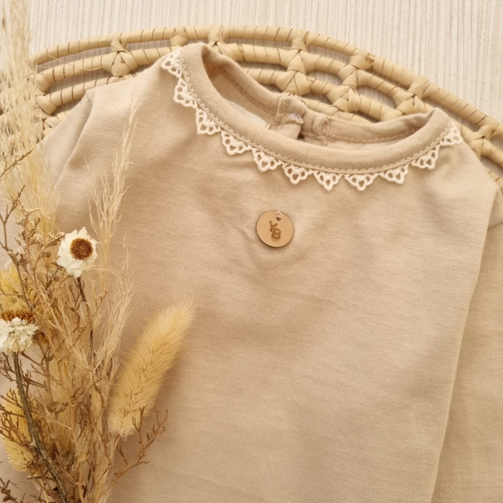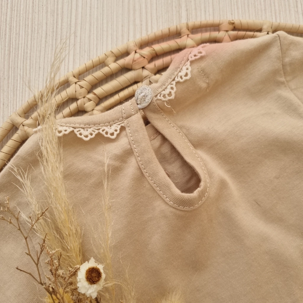 Este body cuenta con una delicada puntilla en el contorno del cuello que aporta un toque de elegancia. Además, su práctico botón en la espalda facilita el vestir y desvestir, mientras que los broches pañaleros permiten un cambio de pañal rápido y sencillo.