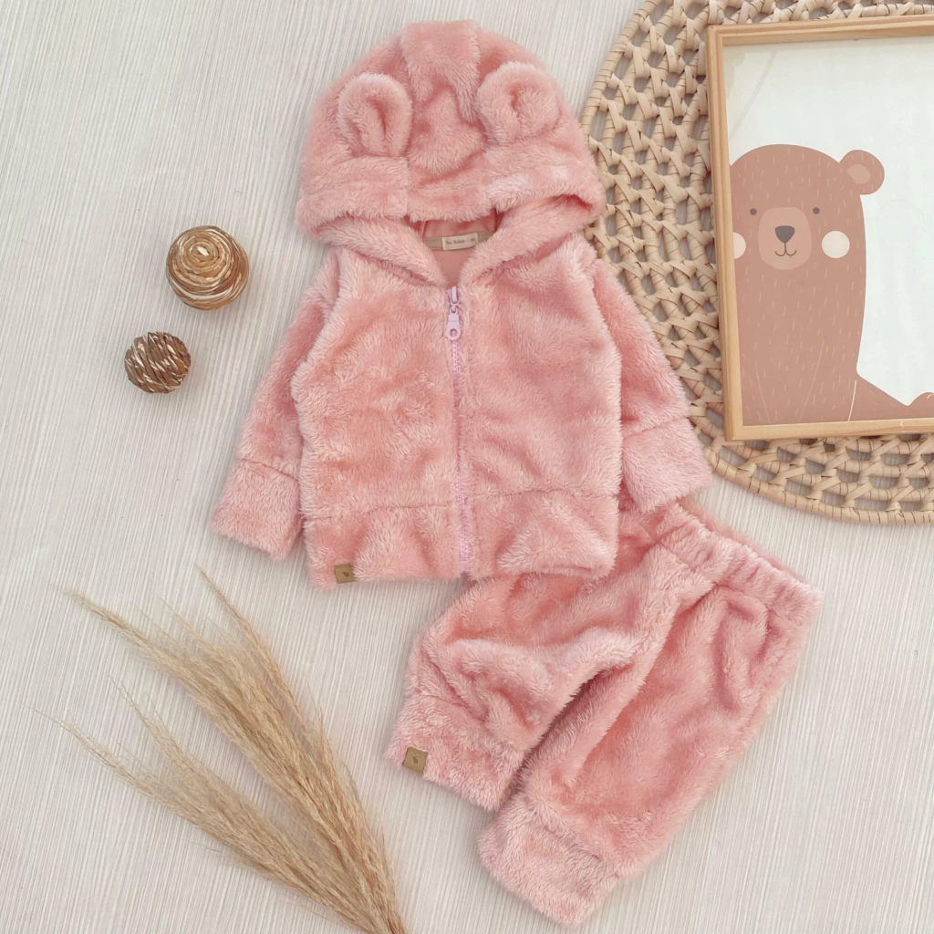 Un conjunto de dos piezas pensado para envolver de ternura los días frescos: campera con orejitas de osito y pantalón haciendo juego. Hecho en jersey con piel tipo peluche por fuera y un interior suave que cuida la piel del bebé. ¡Perfecto para los primeros paseos o para quedarse en casa bien calentito!